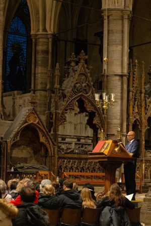 The Evensong service featured choral music by the Westminster Abbey Choir, scripture readings, and prayers for Sri Lanka, its leaders, and its people. His Excellency Nimal Senadheera, High Commissioner of Sri Lanka to the United Kingdom, read the Second Lesson from Matthew 11:2–19.