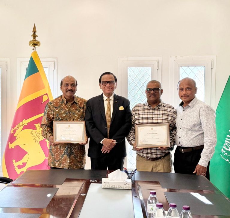 As part of the Embassy’s initiative to honour long-serving Sri Lankan migrant workers in the Kingdom of Saudi Arabia, Ambassador of Sri Lanka to the Kingdom of Saudi Arabia Ameer Ajwad felicitated Mr. Sallay Yazid Rizwie, who had served for 39 years and Mr. Mohamed Riza Huda who had served for 32 years at Jockey Club of Riyadh in the Kingdom in recognition of their dedicated services to the host as well as home countries.