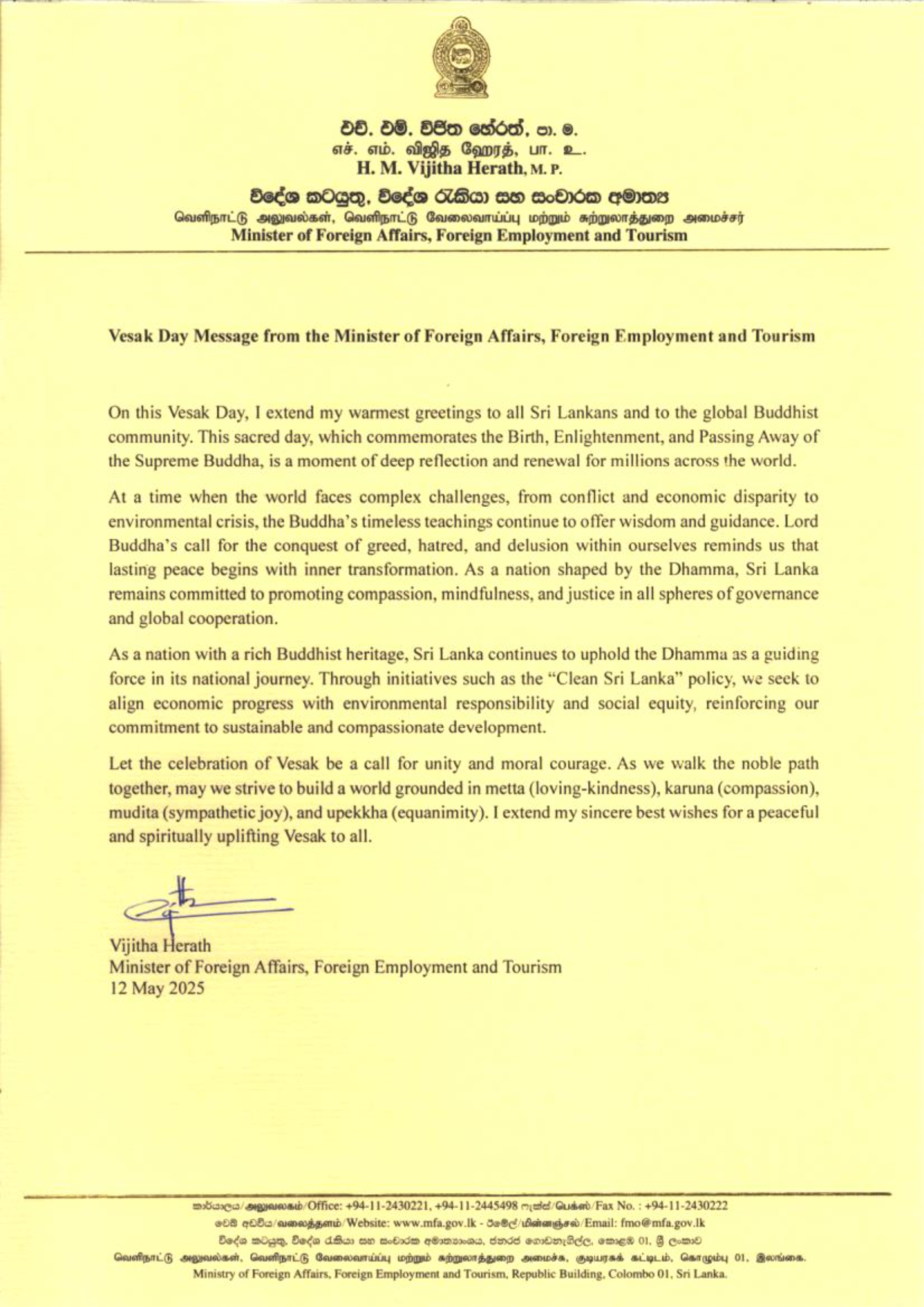 Vesak Day Message from the Minister of Foreign Affairs, Foreign Employment and Tourism