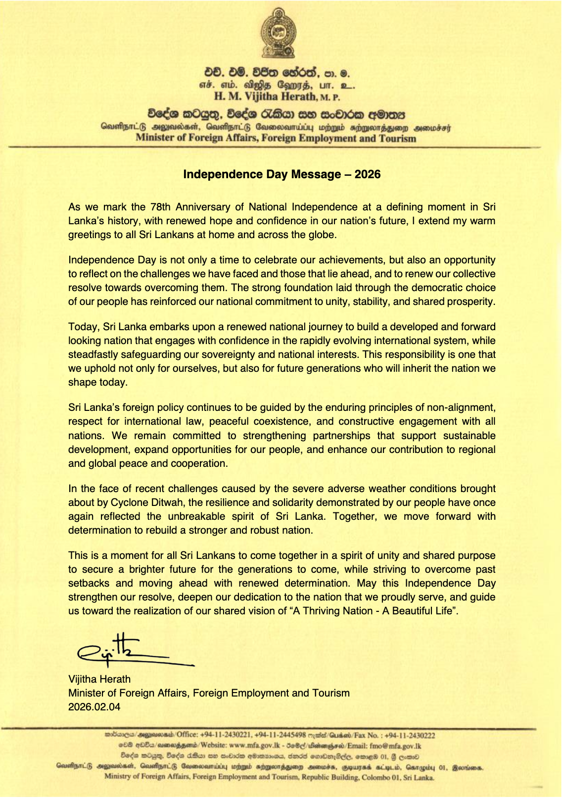 Ministry News Message of Hon. Vijitha Herath, Minister of Foreign Affairs, Foreign Employment and Tourism on the 78th Independence Day Published Date 4 February 2026