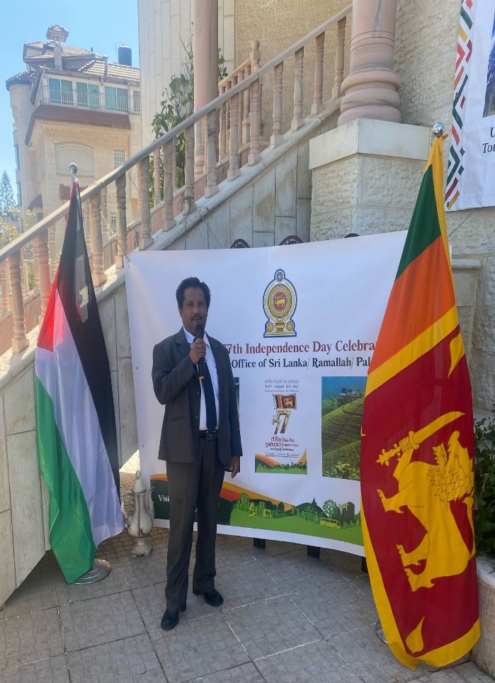 The 77th anniversary of the Independence of Sri Lanka was celebrated at the Representative Office of Sri Lanka in Ramallah under the patronage of Acting Representative of Sri Lanka to Ramallah, S. R. Mahinda Kumar on 04 February 2025. The event was held at the office premises with the participation of Sri Lankans in Palestine, representing Sinhala, Tamil, Muslim and other communities.