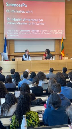 On the invitation of the prestigious French University ScinecesPo, Prime Minister Amarasuriya also participated in an interactive session with students titled “60 Minutes with Dr. Harini Amarasuriya, Prime Minister of Sri Lanka”, which was moderated by Professor Christophe Jaffrelot, Research Director CNRS and Director CERI.   The event was organised by the Paris School of International Affairs and the South Asia Programme at CERI, SciencesPo, and was attended by over 250 students who engaged in a vibrant Q&A with the Prime Minister on political developments in Sri Lanka, democracy and geopolitics of South Asia, Sri Lanka’s foreign policy imperatives, as well as multilateral issues of relevance such as climate change and migration, among other topics.