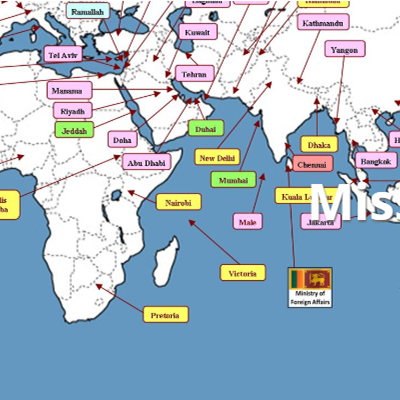 ලොව පුරා පිහිටි ශ්රී ලංකාවේ රාජ්ය තාන්ත්රික දූත මණ්ඩල පිළිබඳ සම්බන්ධතා තොරතුරු සහ වෙනත් ඵලදායී තොරතුරු සඳහා රට, කලාපය, නගරය හෝ සංවිධානය අනුව සෙවීම සිදු කරන්න.