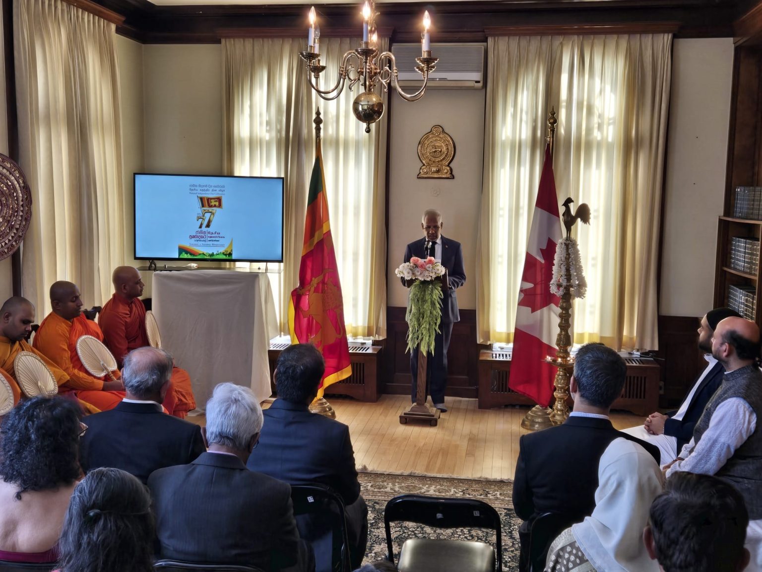 The High Commission of Sri Lanka in Ottawa celebrated the 77th anniversary of the Independence of Sri Lanka together with the Sri Lankan-origin residents in Ottawa on 04 February 2025. Celebrations commenced with the hoisting of the National Flag of Sri Lanka at the Ottawa City Hall by the High Commissioner of Sri Lanka to Canada, U. L. Mohammed Jauhar, accompanied by the resonant sound of Magul Bera. Sri Lankan and Canadian National Anthems were sung, marking the solemnity of the occasion. It was the first time the Sri Lankan National Flag was hoisted at Ottawa City Hall by the High Commissioner, symbolizing the strong bilateral ties and the vibrant Sri Lankan community. Deputy Mayor of Ottawa, Marty Carr, representing the City of Ottawa extended warm greetings on behalf of Mayor of Ottawa, Mark Sutcliffe.