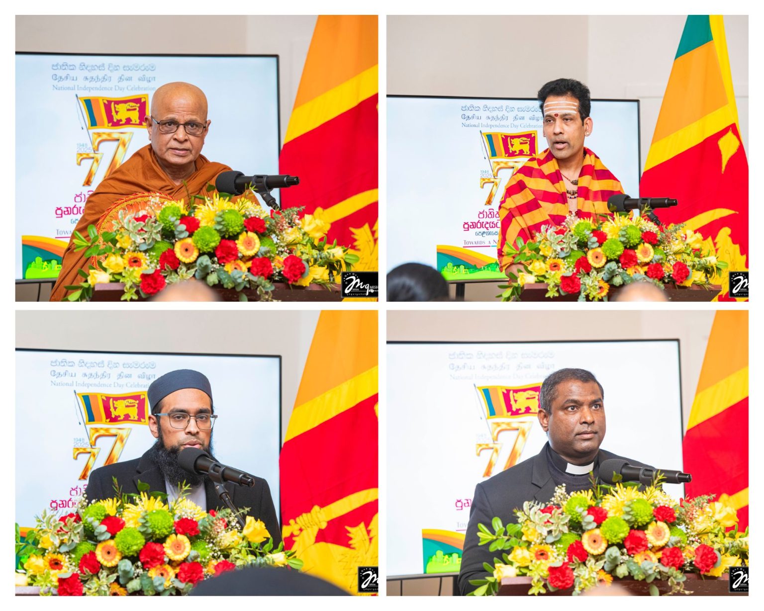 The High Commission of Sri Lanka in the United Kingdom commemorated the 77th Anniversary of Sri Lanka’s Independence on 04 February 2025 at the High Commission premises. The ceremony commenced with the singing of the National Anthem in Sinhala, followed by a two-minute silence in remembrance of those who sacrificed their lives for the nation. Chief Sanga Nayake of Great Britain & Chief Incumbent of London Buddhist Vihara Most Ven Bogoda Seelawimala Thero, Reverend Sivananthasarma Sivaruban Kurukkal, Sheikh Thalha Siddiq of Sri Lanka Muslim Cultural Centre in Harrow, and Reverend Father Kamal Kumara of the Sri Lankan Catholic Chaplaincy conducted multi-faith religious observances invoking blessings for peace, unity, and prosperity of the country.