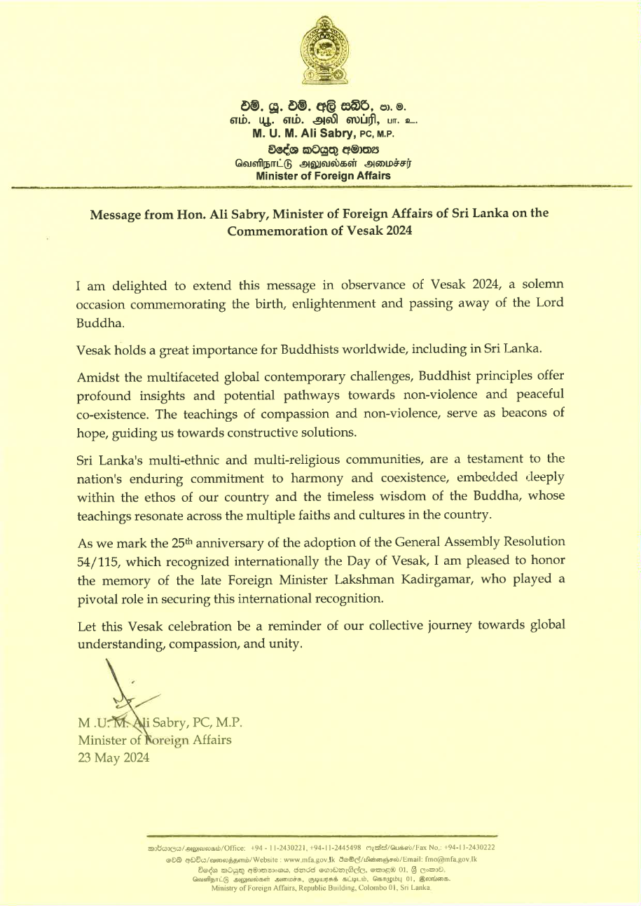 The message of Hon. M.U.M Ali Sabry, Foreign Minister of Sri Lanka for Vesak Day 2024