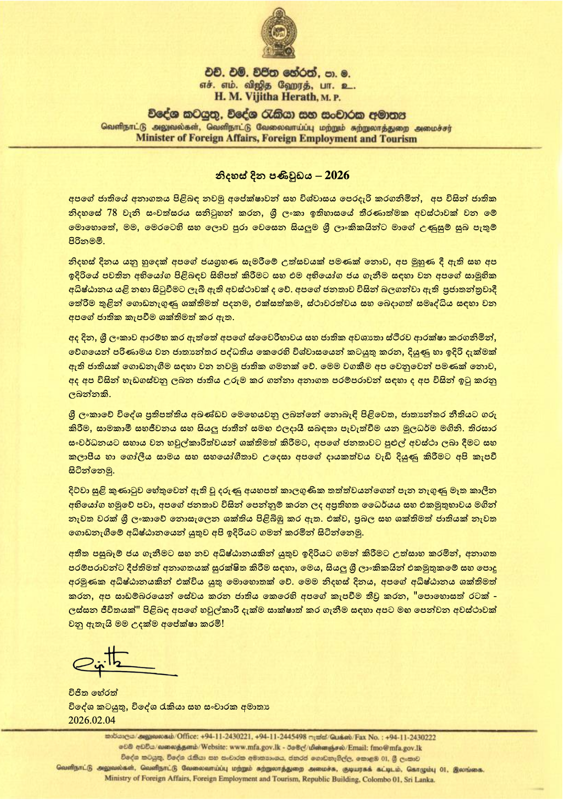 Message of Hon. Vijitha Herath, Minister of Foreign Affairs, Foreign Employment and Tourism on the 78th Independence Day