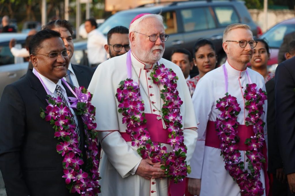 විදේශ කටයුතු සහ විදේශ රැකියා නියෝජ්ය අමාත්ය අරුන් හේමචන්ද්ර විසින් අගරදගුරු හිමිපාණන් පිළිගනු ලැබීය. ශ්රී ලංකාවේ කතෝලික රදගුරු සම්මේලනයේ සභාපති අතිගරු කාදිනල් මැල්කම් රංජිත් සහ අතිගරු ආචාර්ය හැරල්ඩ් පෙරේරා යන හිමිපාණන් වහන්සේලා, බණ්ඩාරනායක ජාත්යන්තර ගුවන්තොටුපළේදී, ශුද්ධාසනයේ දූත පිරිස පිළිගැනීමට එක් වුහ.